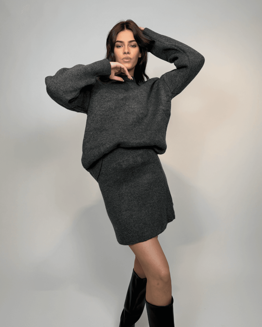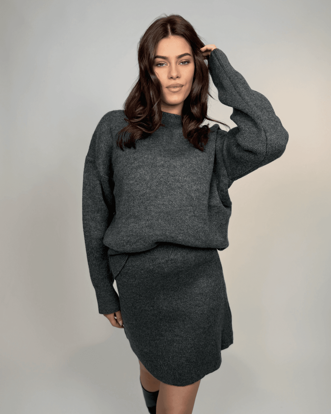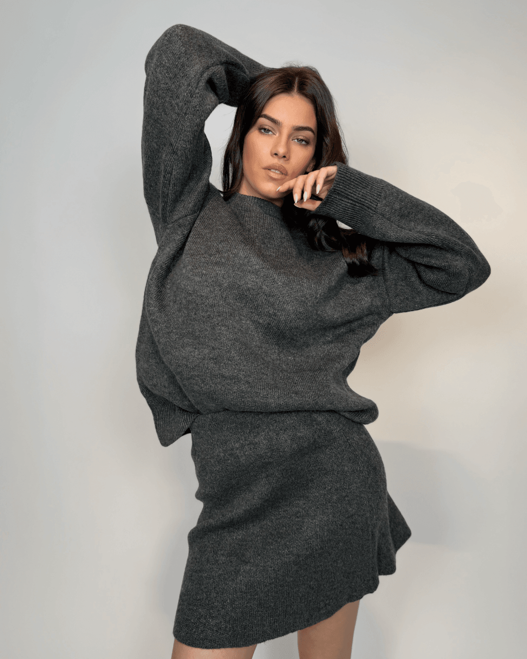 Komplet se sastoji od mekanog, oversized pulovera i mini suknje ravnog kroja – kombinacije koja pruža savršenu ravnotežu između ležernog i elegantnog stila.