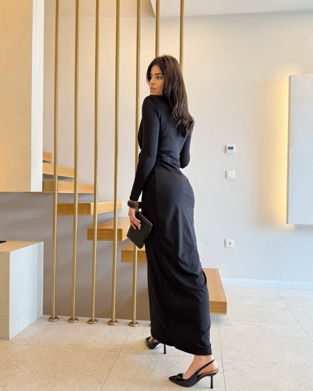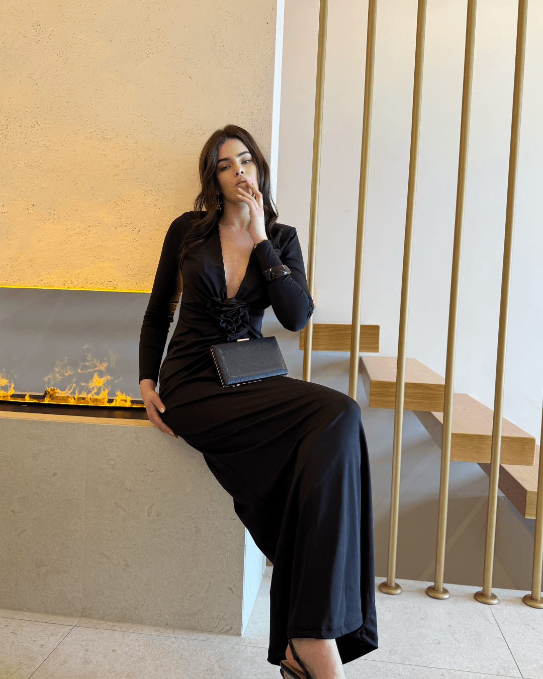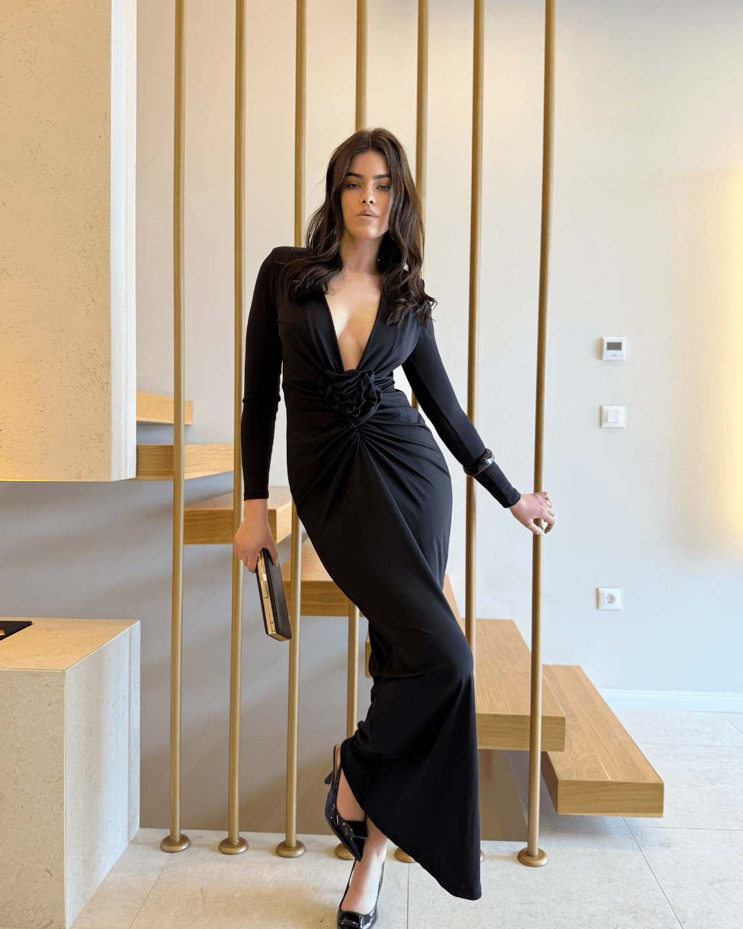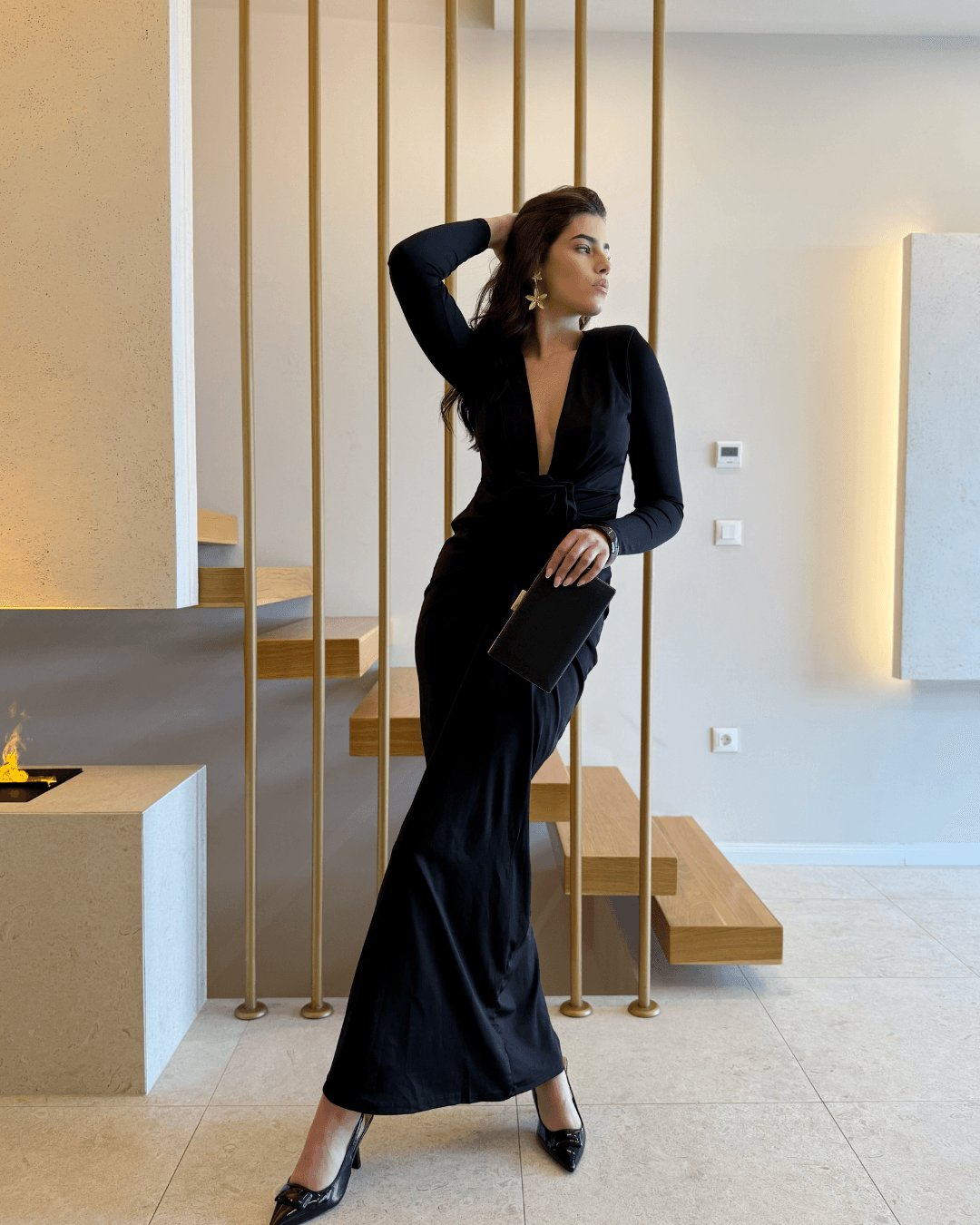 Elegantna maxi haljina s dubokim V-izrezom i profinjenim čvor-drap detaljem u struku savršena je za večernje prilike, posebne događaje i svečane trenutke. Istaknuti čvor vizualno oblikuje figuru, dok mekani materijal lijepo pada i pruža udobnost tijekom nošenja.