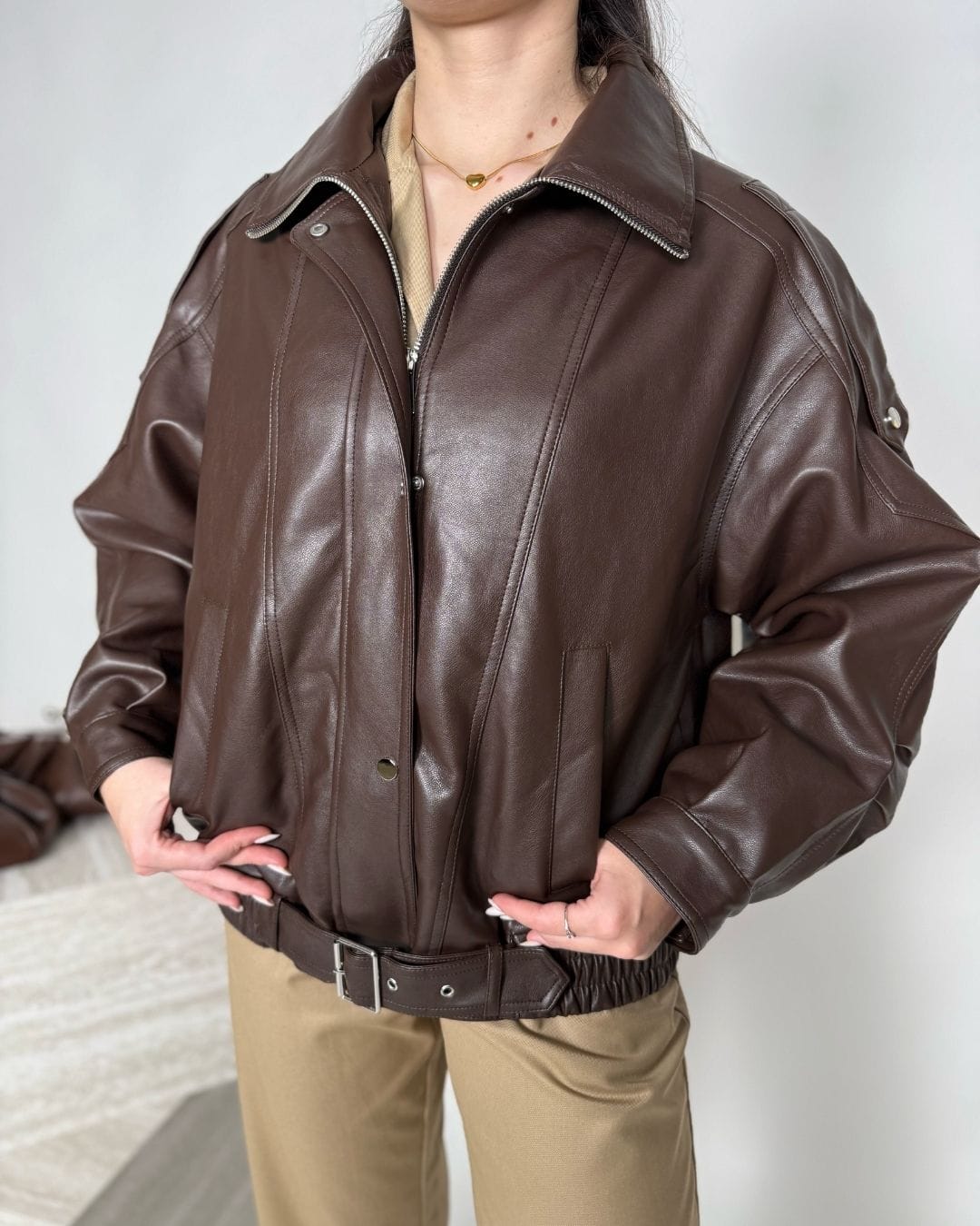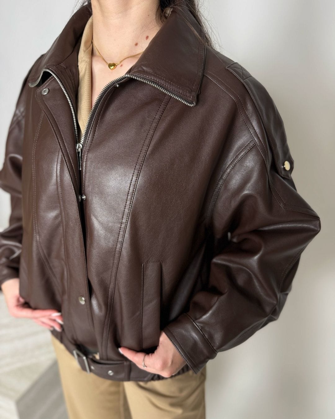 Jakna Urban Brown moderna je ženska jakna od eko kože u toploj smeđoj nijansi koja unosi dozu urbanog stila u svaku kombinaciju. Blago oversized kroj s patentnim zatvaračem i remenom na dnu omogućuje prilagodbu širine i dodatnu udobnost. Klasični ovratnik i minimalistički detalji čine ovu jaknu bezvremenskim komadom koji se lako kombinira s trapericama, hlačama ili haljinama.